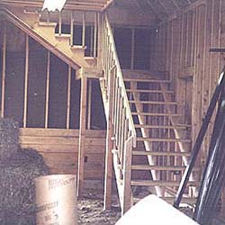 In August 2001 we featured the 32x40 Horse Barn built by Kathleen Doyle, Office Administrator for an Environmental Engineering Company and her partner Anne Breen, Chief of Security at the New Hampshire Technical Institute in Concord, New Hampshire,who own a Gambrel Log home on 10 Acres in Salisbury, New Hampshire. They also own 2 horses and needed to build a barn that would not only accommodate the horses, but would also serve as a storage area for yard equipment and a tractor. Kathleen and Anne wanted a Gambrel style barn that would compliment their log home and felt that the 32 x 40 Horse Barn plans would adequately meet the needs of their animals and equipment. They incorporated the help of Kathleen's brother Mark Roberts, a former carpenter by trade, to assist and supervise them in the construction of the barn. In addition to Kathleen's brother, two close friends, Pat Collins and Bob Drake also added their skills and labor to the building of the barn. Over the course of the construction, several friends and neighbors were enticed by the fact that Kathleen and Anne, along with their family and friends, were building the barn themselves and eagerly volunteered their services, as well. All of the construction was done on weekends and after their regular 8 to 5 jobs. It took 3 months to complete the shell of the barn and by the end of two years, all the inside and outside finish work and trim was completed.